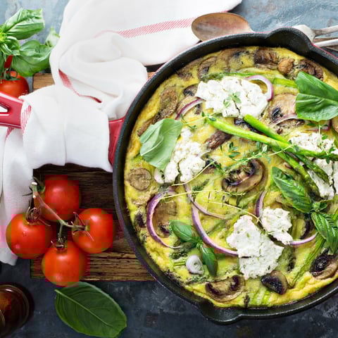 Add goat cheese in slices over frittata and place in oven baking until eggs are set and the goat cheese is melted about 15 minutes. Garnish with fresh basil and thyme and serve immediately.