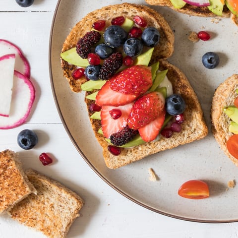Add sliced avocado to toast. Place berries and pom seeds on avocado. Drizzle with honey (optional) Serve immediately.