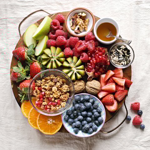 Using a cutting board or a sheet pan covered with parchment paper, assemble bowls of granola, milk, berries and nuts on the board and fill in with cut fruit. Great for a special breakfast in bed treat!