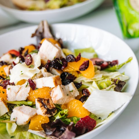 In a large bowl add chopped romaine salad mix, oranges, strawberries, dried cherries, salmon chunks and shaved parmesan.
