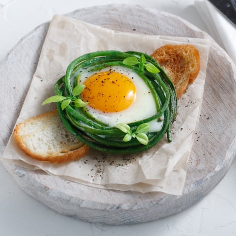 On a parchment lined baking sheet, place a baguette slice horizontally touching edges. Start placing the cooked French beans in a nest shape and make sure the middle where the baguette edges touch only has a few beans to make a nest floor. Continue to weave or bend the beans to look nest shaped but making sure the walls of the nest are high enough to handle the cracked egg when it is placed in the center. When you are happy with your nest, crack an egg in the center and drizzle the bread with olive oil or melted butter.