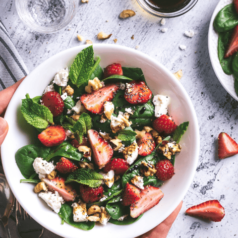 In a large bowl add spinach, strawberries, mint leaves and walnuts. Toss to evenly distribute. Top with feta cheese and reserved strawberries.